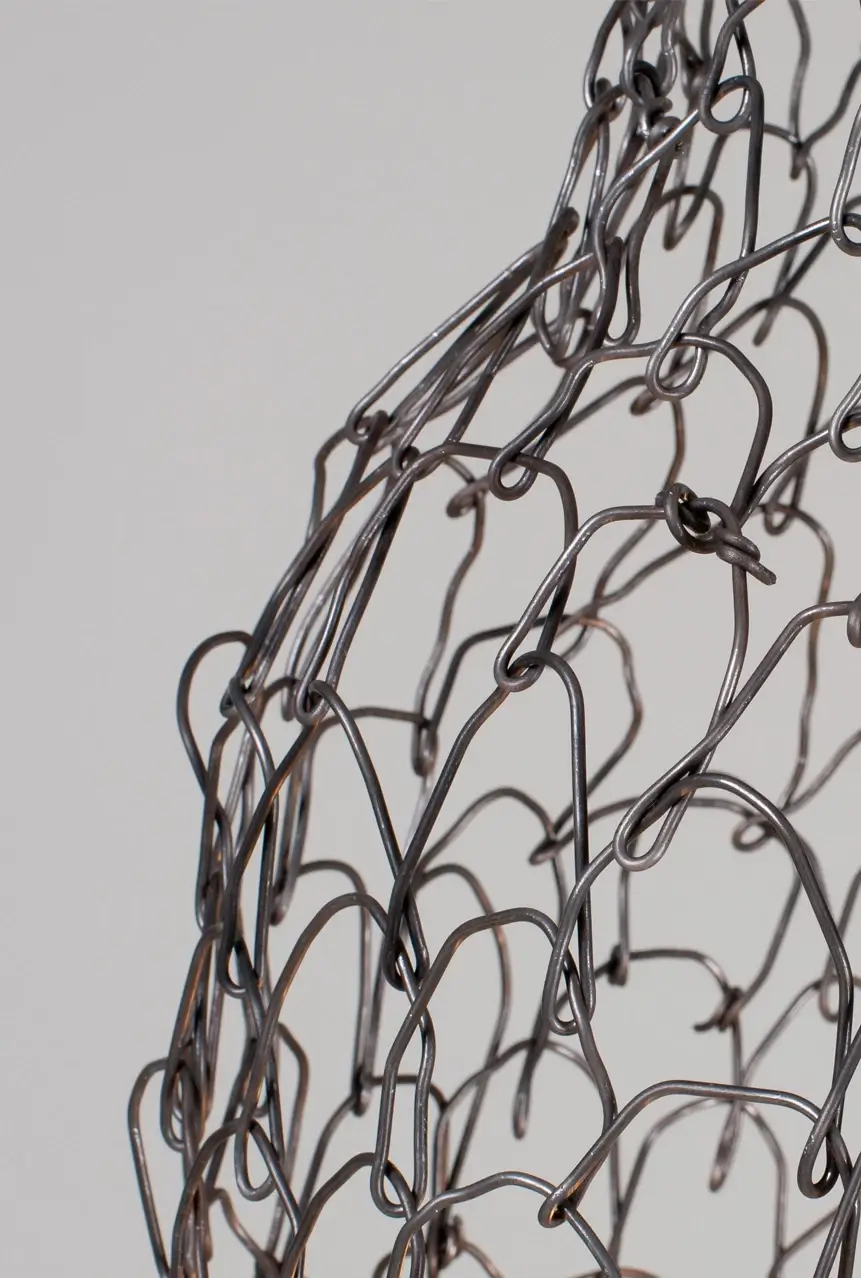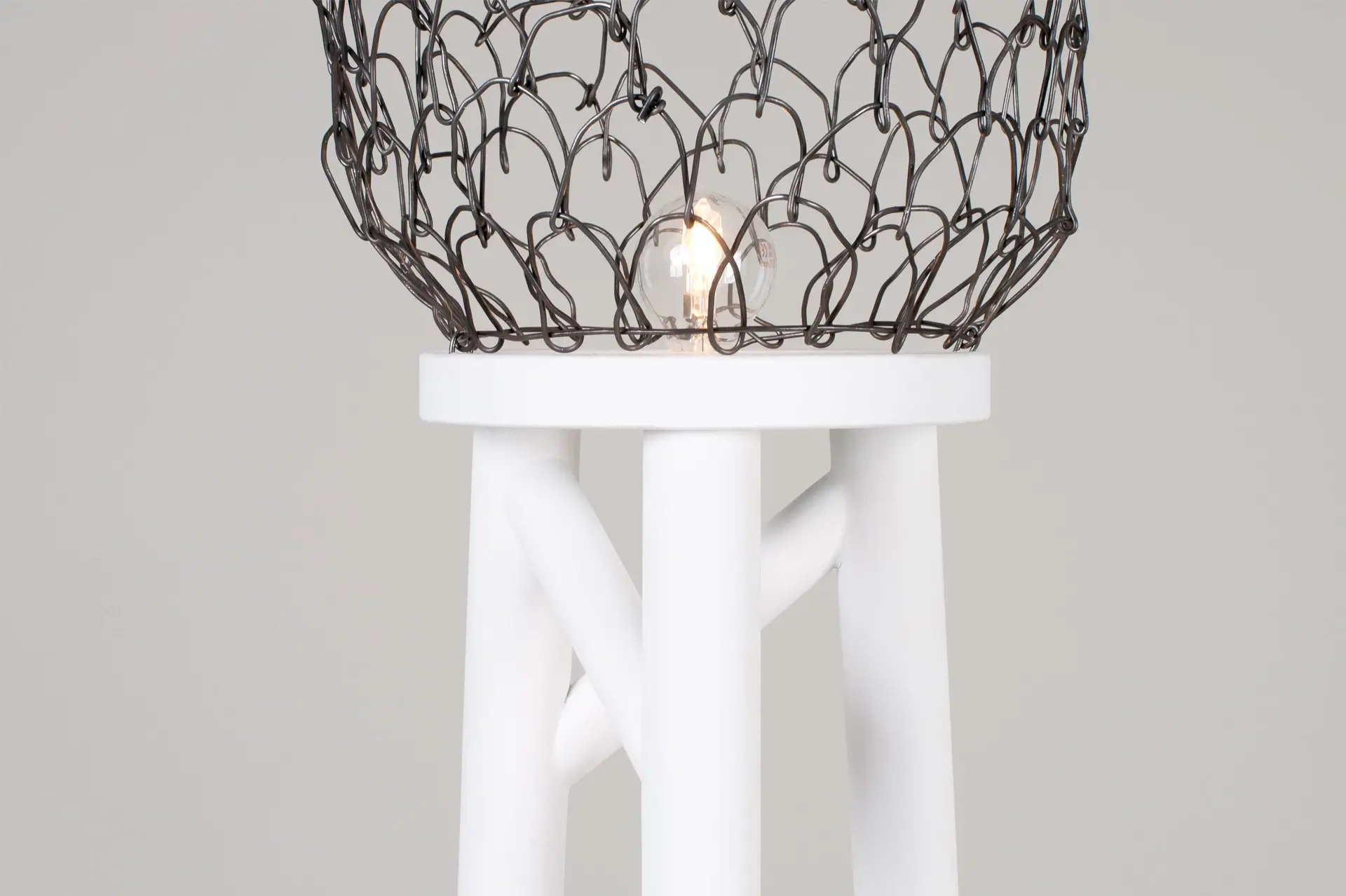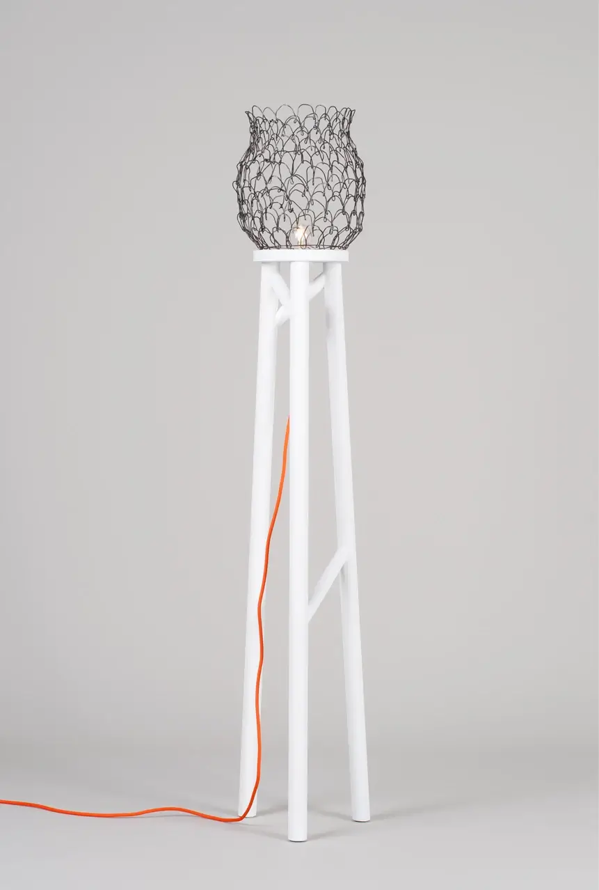Základňu lampy tvoria subtílne biele nohy s precízne spracovanými spevňovacími prvkami, ktoré jej dodávajú stabilitu a architektonický ráz. Skutočným vizuálnym zážitkom je však drôtené tienidlo. Svojím subtílnym výpletom vykresľuje v priestore ikonickú siluetu keramického džbánu, čím vzdáva hold tradičnému remeslu v modernom, industriálnom prevedení.