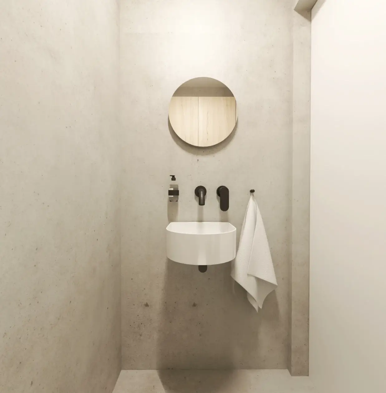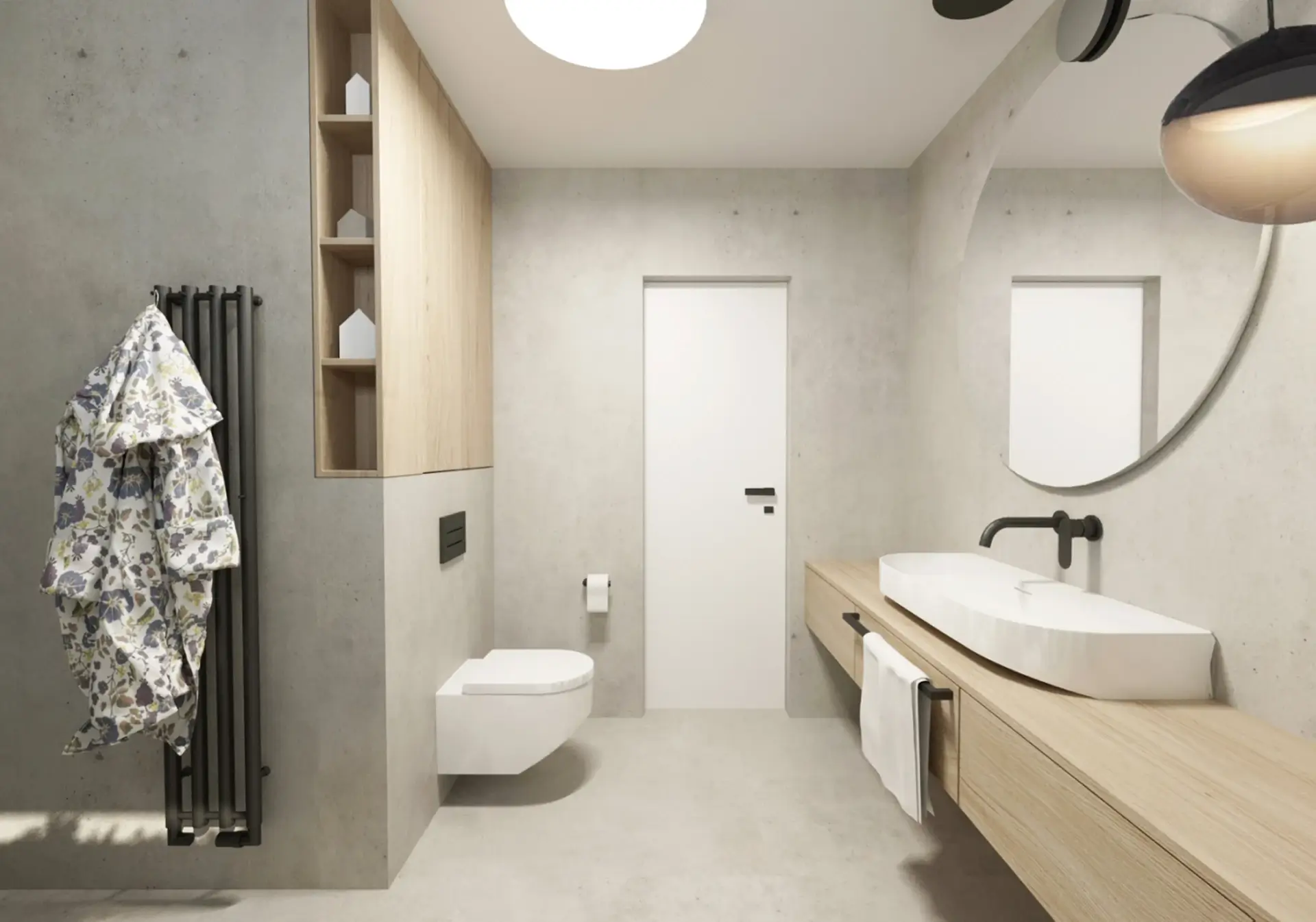 Návrh kúpeľne s betónovou stierkou, bielenným dubom a čiernymi batériami, BA Bathroom, Bratislava