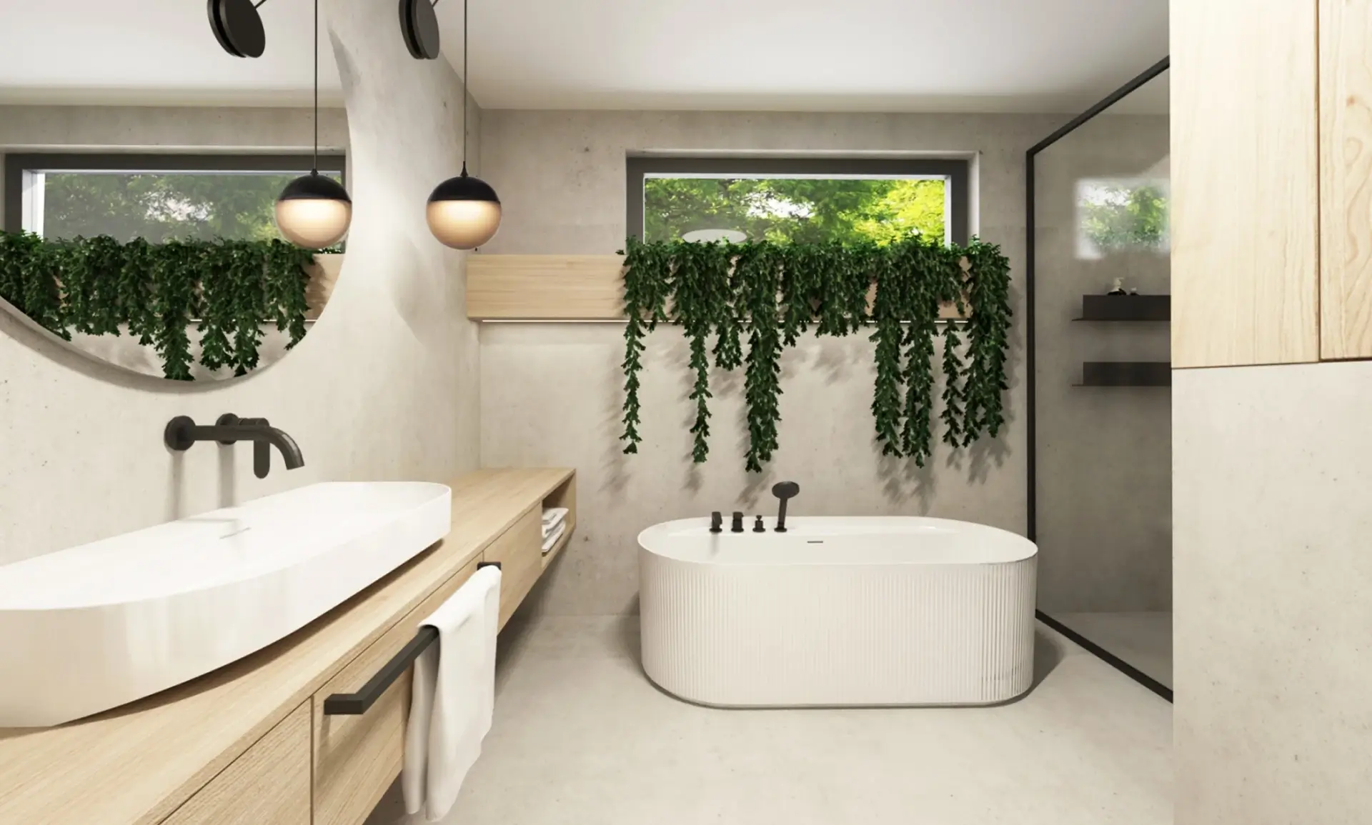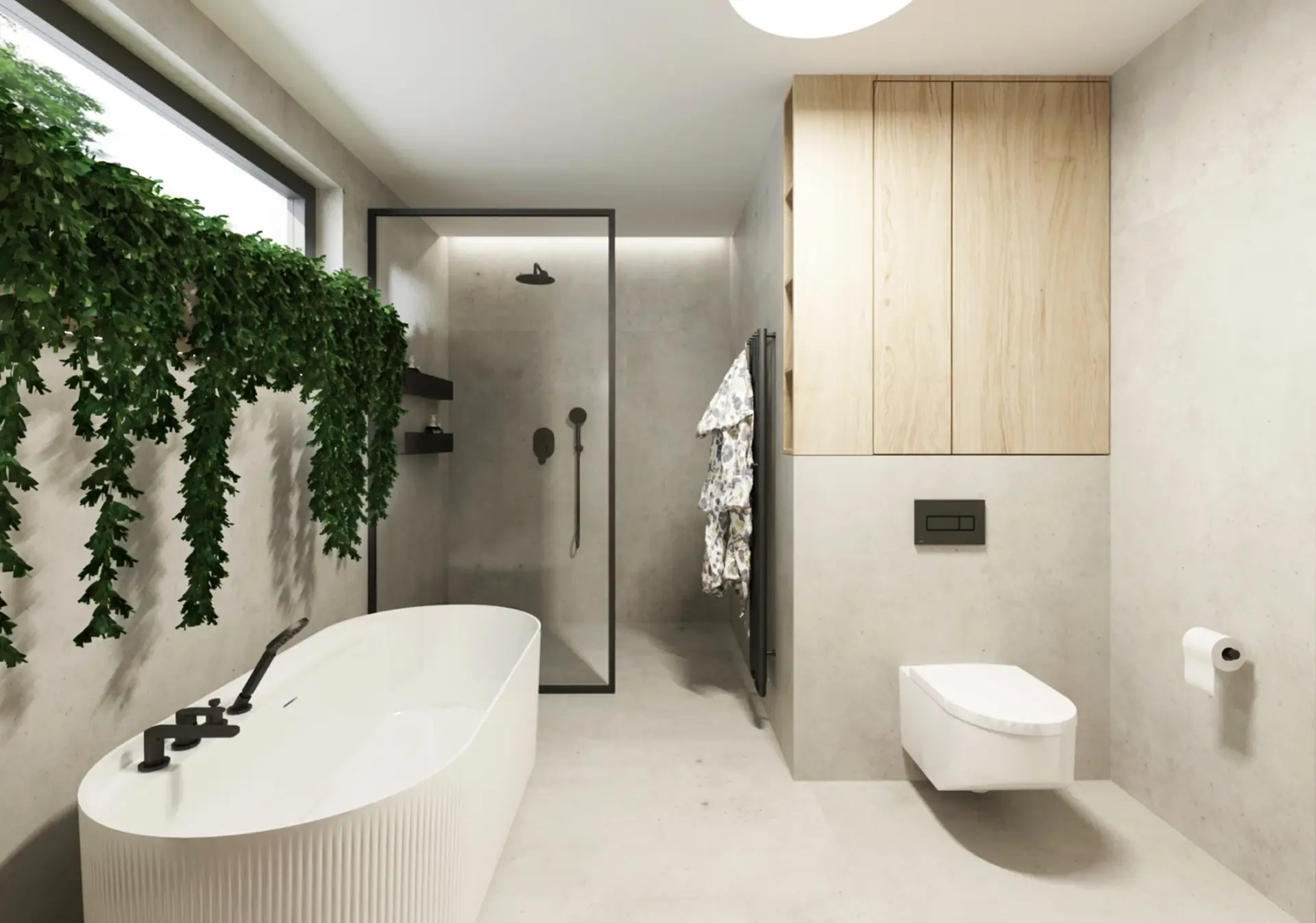 Doplňujúcim  prvkom, ktorý do kúpeľne vnáša život a emóciu, sú bohaté rastliny umiestnené v okennom výklenku. Ich listy sa prirodzene spúšťajú priamo nad solitérnu vaňu a vytvárajú tak intímnu zelenú clonu. Tento biofilný detail vnáša do interiéru oživenie a pocit domáceho spa.