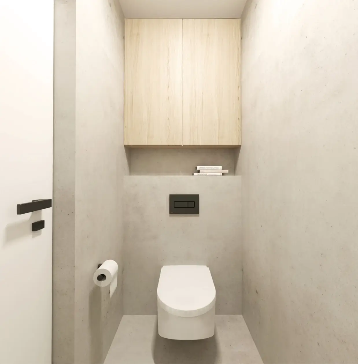 Návrh kúpeľne a toalety v novostavbe rodinnej drevostavby neďaleko Bratislavy stavia na čistote materiálov a precíznom dispozičnom riešení. Premyslenou úpravou pôvodného pôdorysu sa podarilo vytvoriť dve funkčne nezávislé zóny: samostatnú toaletu a veľkorysú rodinnú kúpeľňu, ktorá v sebe spája komfort priestrannej solitérnej vane aj moderného sprchového kúta.