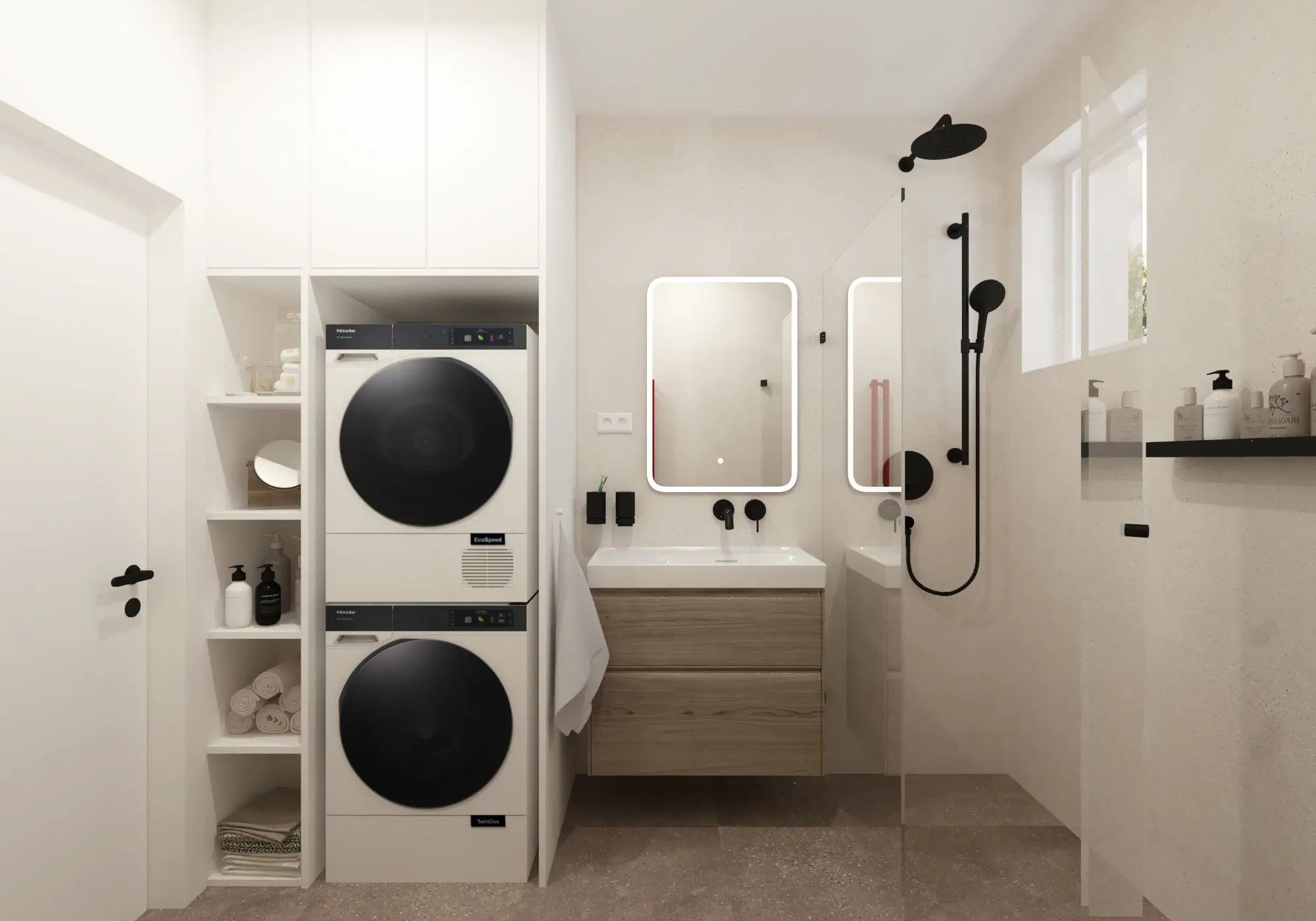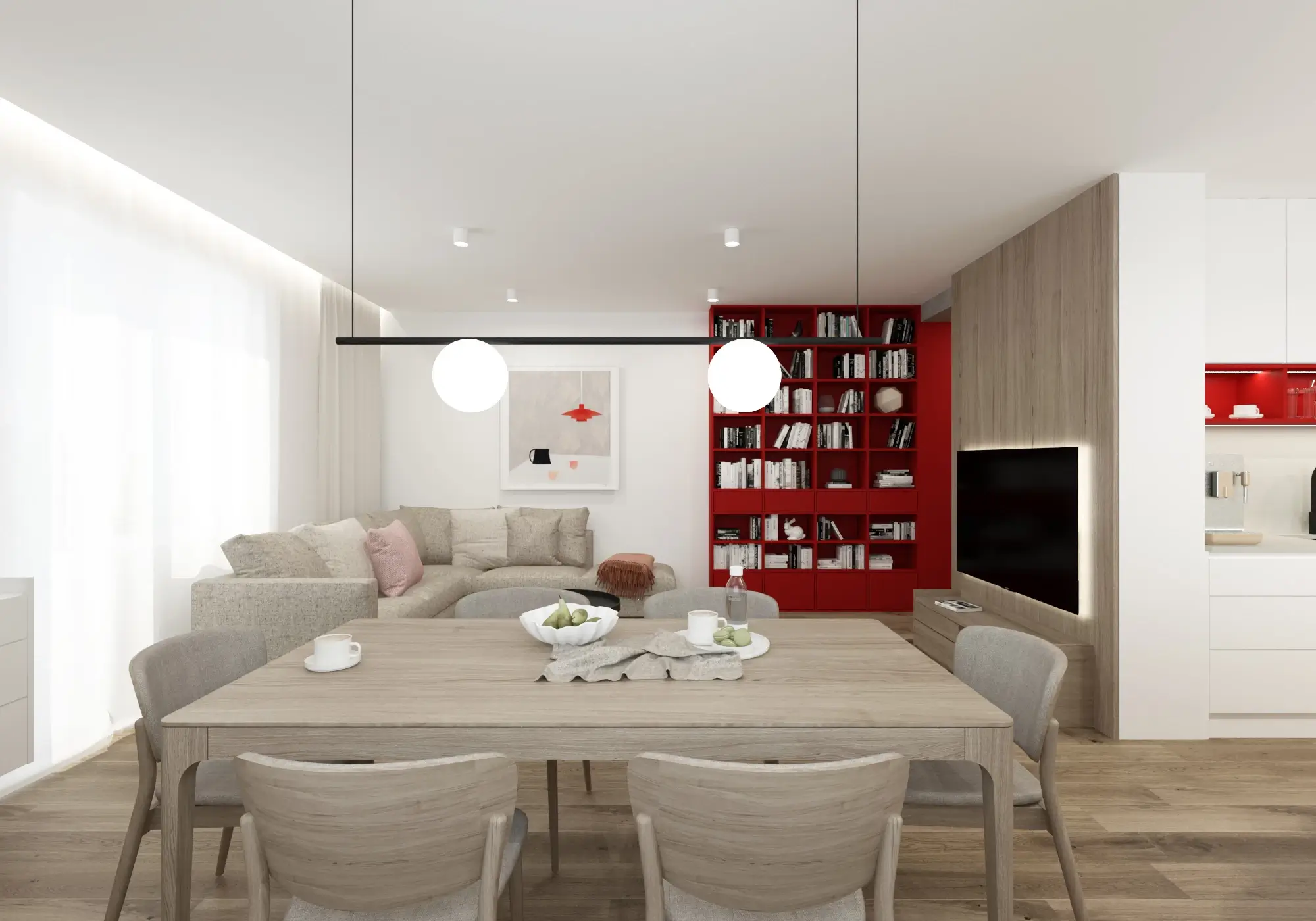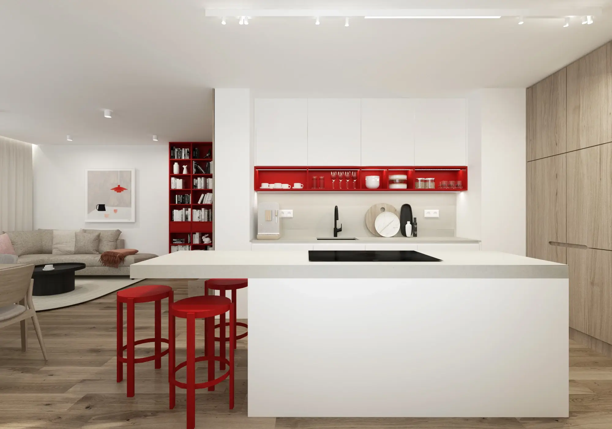 Aby vynikol charakteristický červený solitér, zvyšok interiéru sme ponechali v pokojných neutrálnych tónoch. Čisté línie, svetlé povrchy a prírodné textúry vytvárajú vyvážené pozadie, vďaka ktorému pôsobí byt vzdušne, moderne a napriek svojej farebnej odvahe veľmi harmonicky.