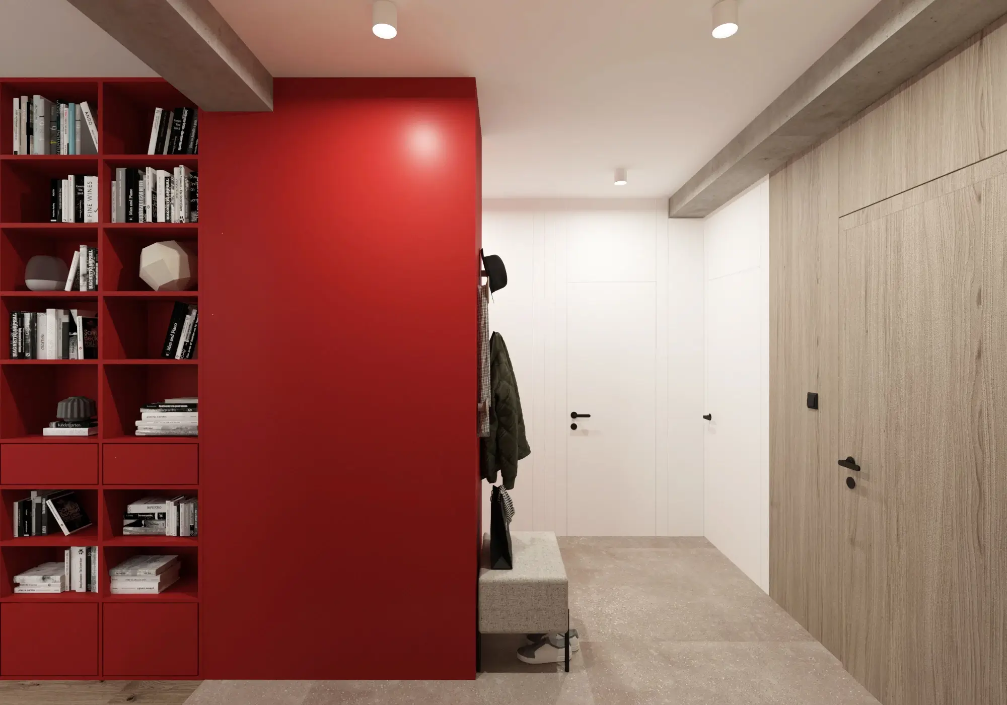 Vizuálnu identitu interiéru definuje výrazný červený blok, ktorý v sebe spája funkciu šatníka a knižnice. Tento dominantný prvok plynule prechádza zo vstupnej chodby až do hlavnej obytnej časti, čím priestor opticky prepája a dodáva mu jasný smer. Odvážnu farebnosť sme citlivo vyvážili drobnými akcentmi – červená sa rytmicky opakuje na barových stoličkách a subtílnej kuchynskej polici.