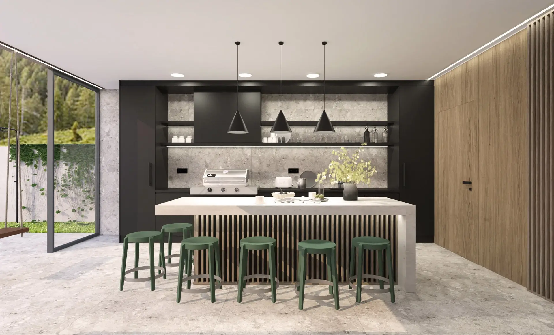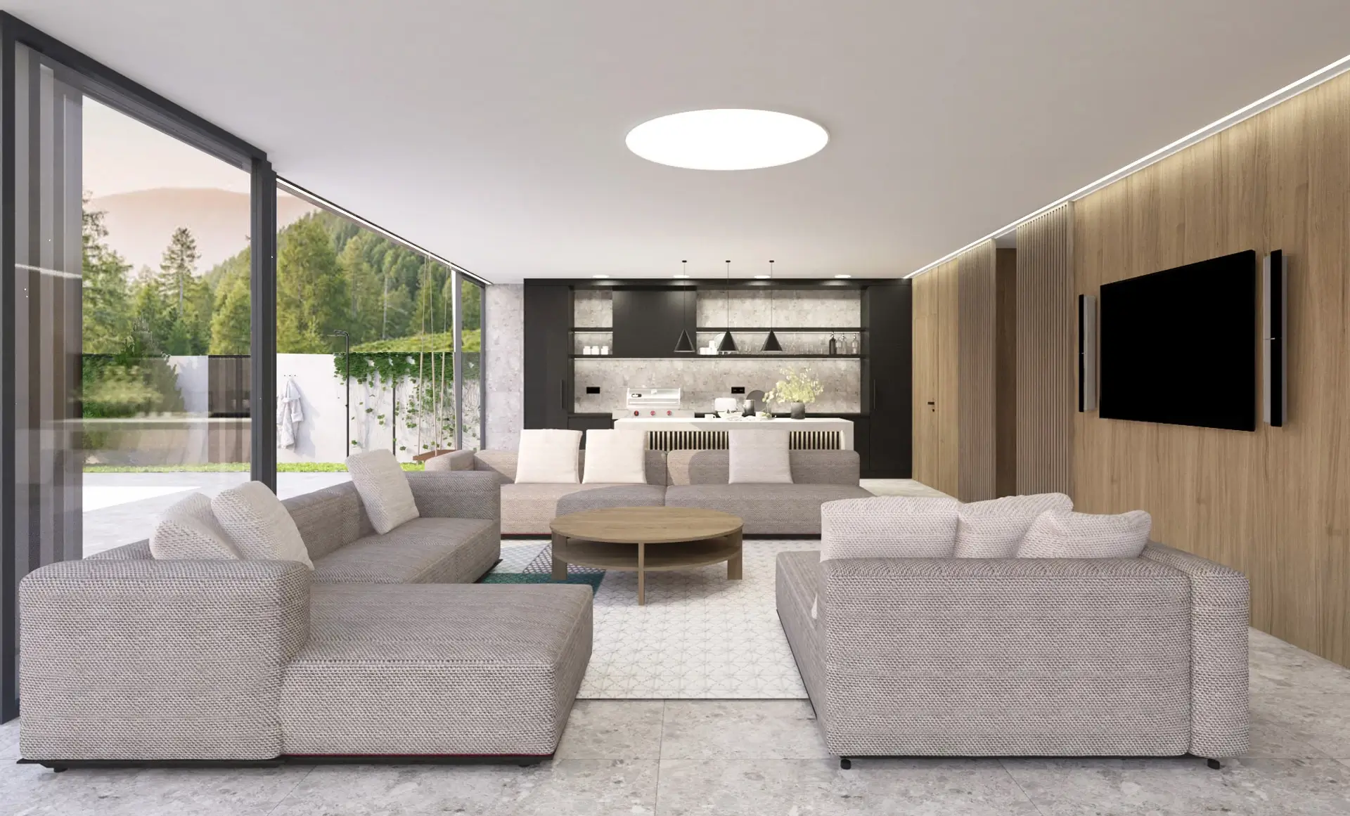 Srdcom domčeka je štýlová letná kuchyňa s barom, ktorá prirodzene nadväzuje na komfortnú lounge zónu s TV. Celý priestor je navrhnutý tak, aby slúžil ako centrum rodinného života a spoločenských stretnutí počas letných večerov. Za estetickým dreveným obkladom sa diskrétne skrýva kompletné zázemie: veľkorysé úložné priestory, sklad, kúpeľňa a samostatná toaleta.