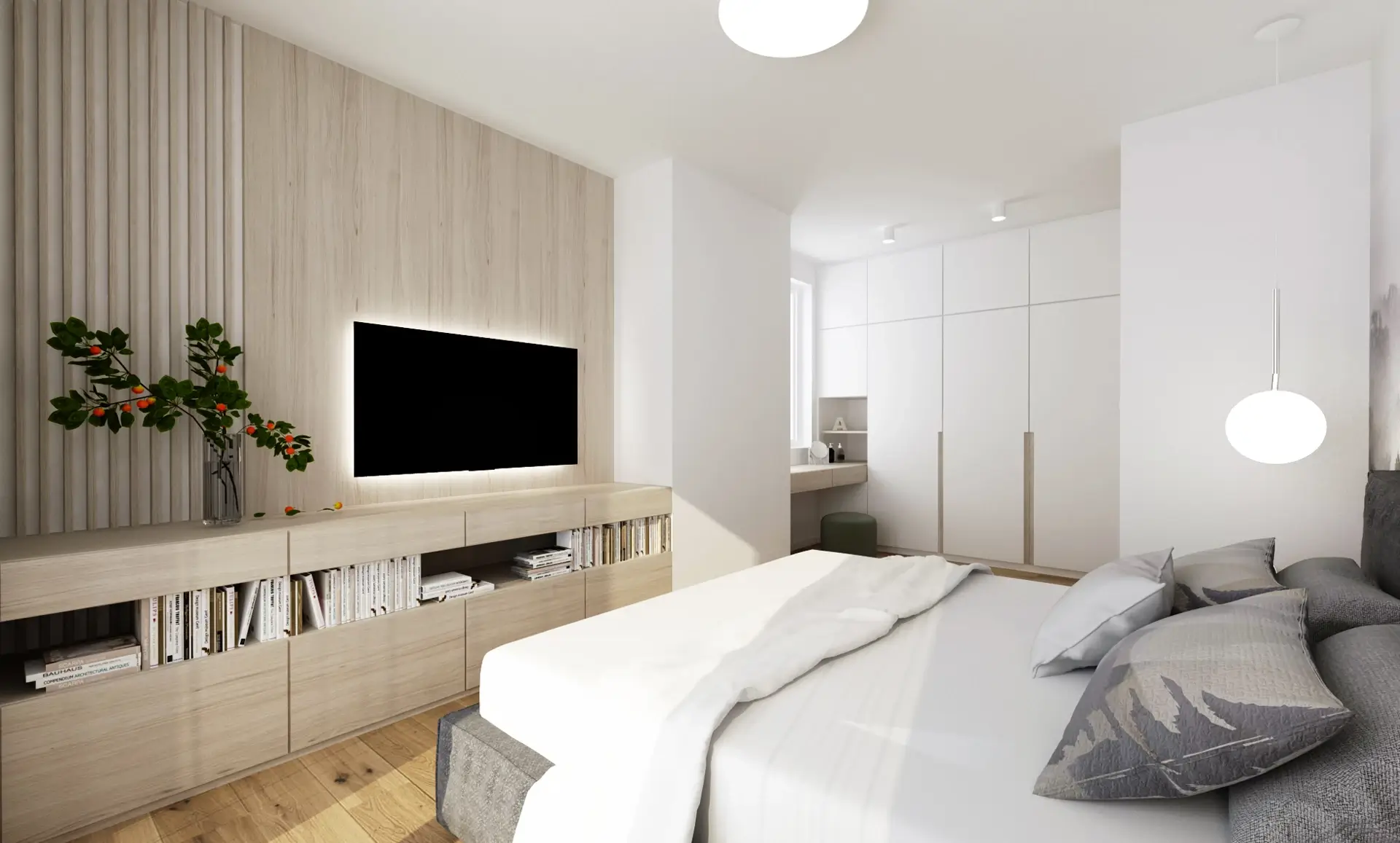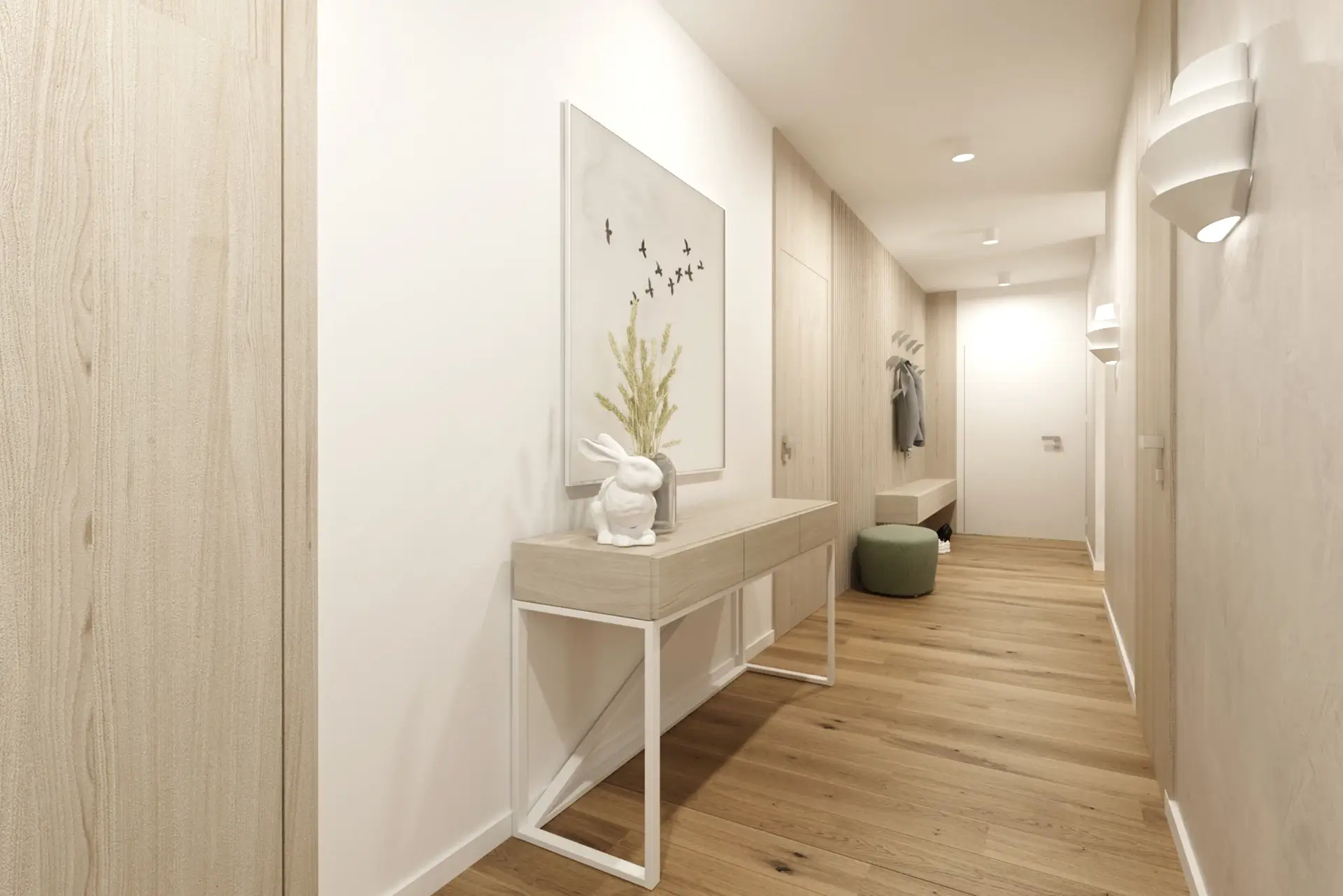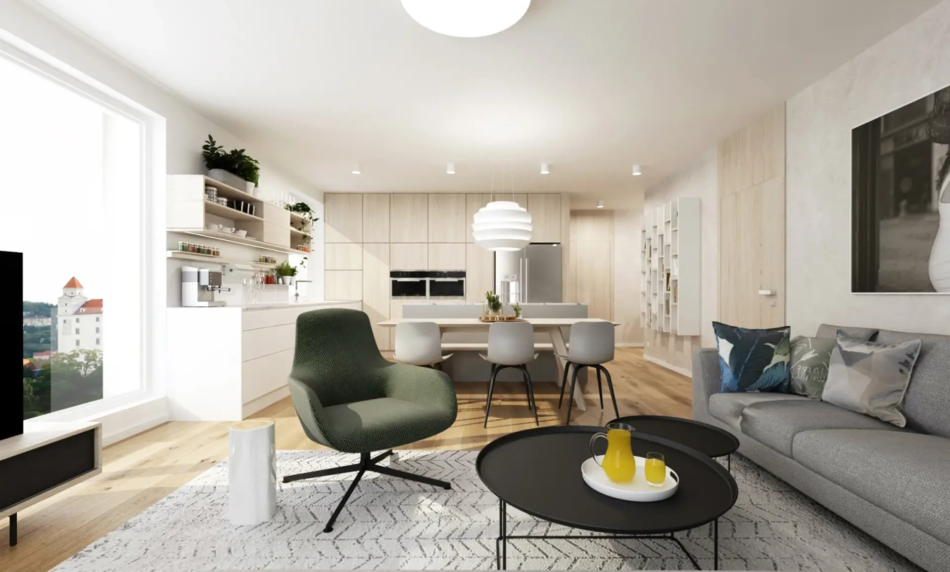 Tento unikátny penthouse s nádhernými výhľadmi na Bratislavský hrad a mestskú panorámu sme premenili na oázu pokoja nad rušným mestom. Interiér je koncipovaný v jemnej, svetlej farebnej palete, ktorá prirodzene rozptyľuje denné svetlo a opticky ešte viac zväčšuje priestor. Hlavným cieľom bolo vytvoriť čistý, ničím nerušený vizuál, ktorý si vyžiadal premyslené riešenie úložných priestorov. Tie sme do interiéru integrovali vo forme bielych vstavaných šatníkov a nábytkových zostáv, ktoré splývajú so stenami a pôsobia takmer neviditeľne.