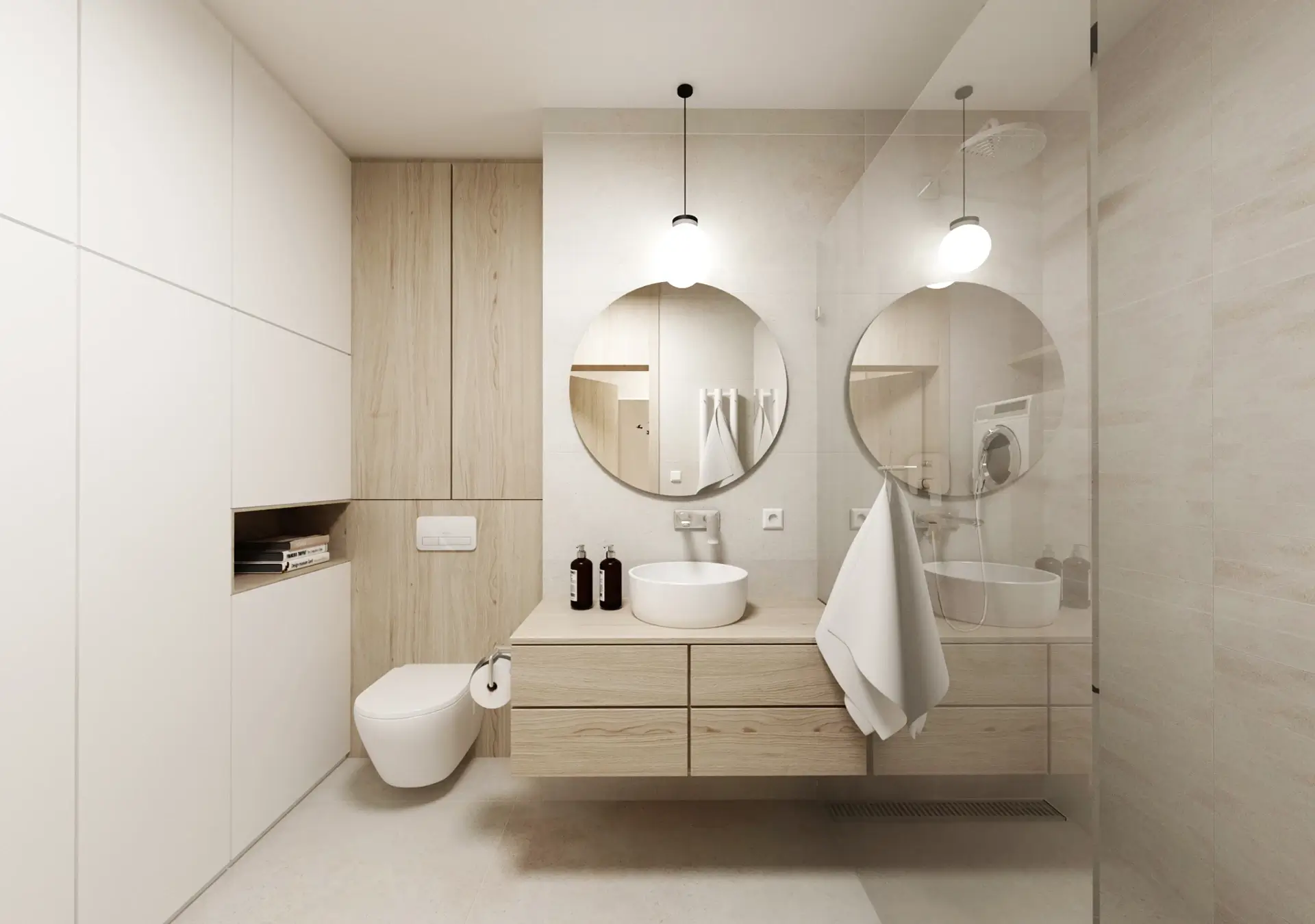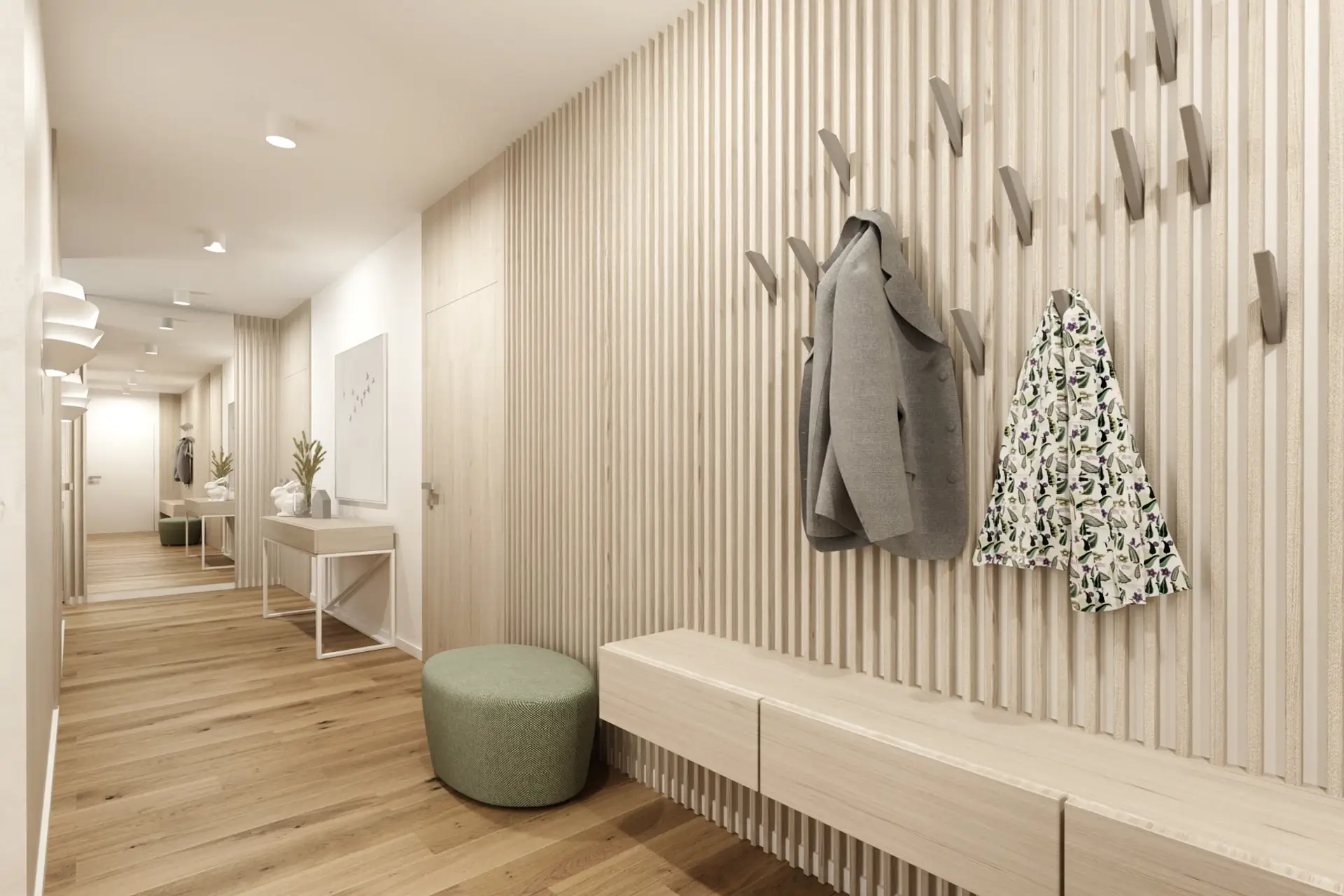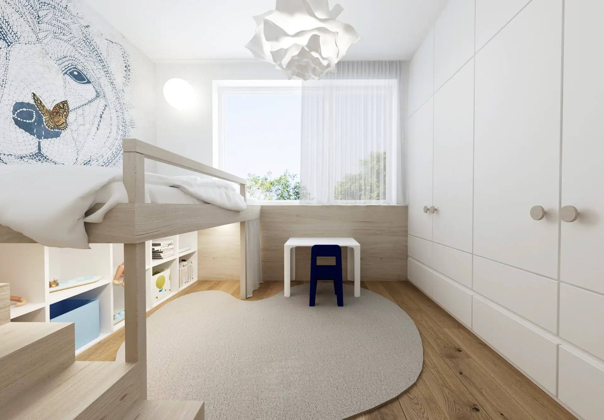 Tento unikátny penthouse s nádhernými výhľadmi na Bratislavský hrad a mestskú panorámu sme premenili na oázu pokoja nad rušným mestom. Interiér je koncipovaný v jemnej, svetlej farebnej palete, ktorá prirodzene rozptyľuje denné svetlo a opticky ešte viac zväčšuje priestor. Hlavným cieľom bolo vytvoriť čistý, ničím nerušený vizuál, ktorý si vyžiadal premyslené riešenie úložných priestorov. Tie sme do interiéru integrovali vo forme bielych vstavaných šatníkov a nábytkových zostáv, ktoré splývajú so stenami a pôsobia takmer neviditeľne.