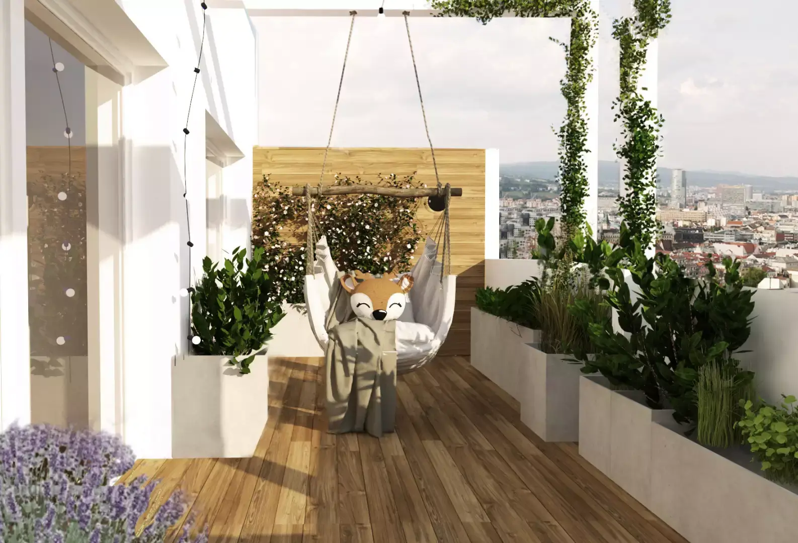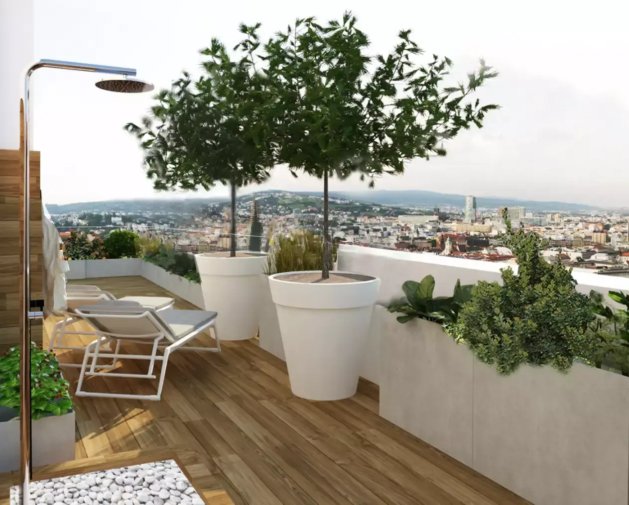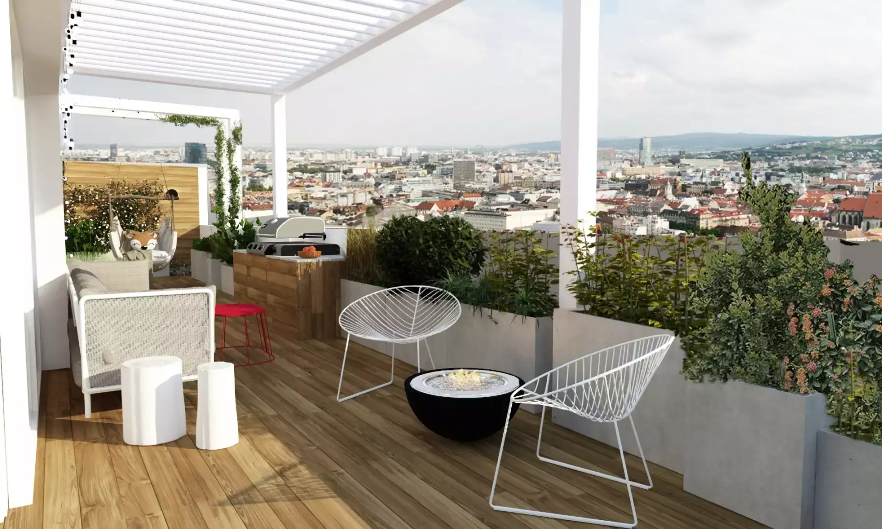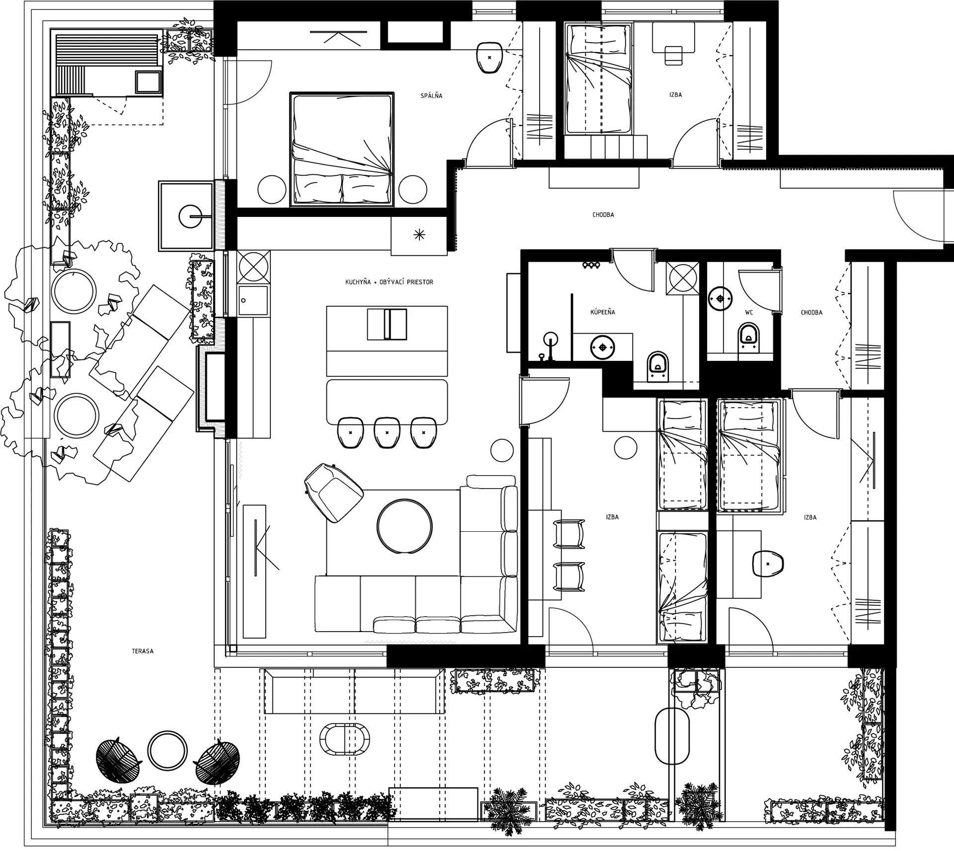 Srdcom bytu je plynulé prepojenie dennej zóny s rozľahlou terasou, ktorá slúži ako plnohodnotná súčasť bytu. Aby sme využili jej potenciál na maximum, navrhli sme tu súkromný wellness kútik so saunou a vonkajšou sprchou – ideálne miesto na regeneráciu s výhľadom na nočné mesto. Zvyšnú časť terasy tvorí oddychová zóna s množstvom zelene a pohodlným sedením, ktoré poskytuje dostatok súkromia pre nerušený relax alebo večerné posedenia s priateľmi. Časť je zastrešená pergolou, kde sme umiestnili exteriérovú kuchyňu a ukončená je miestom na cvičenie jógy pri východe slnka.Výsledkom je bývanie, ktoré spája mestskú dynamiku s maximálnym komfortom a pocitom slobody.