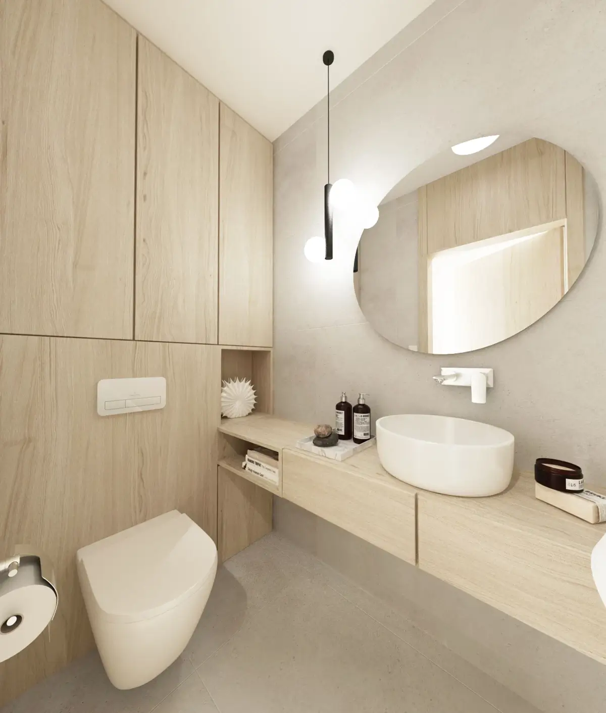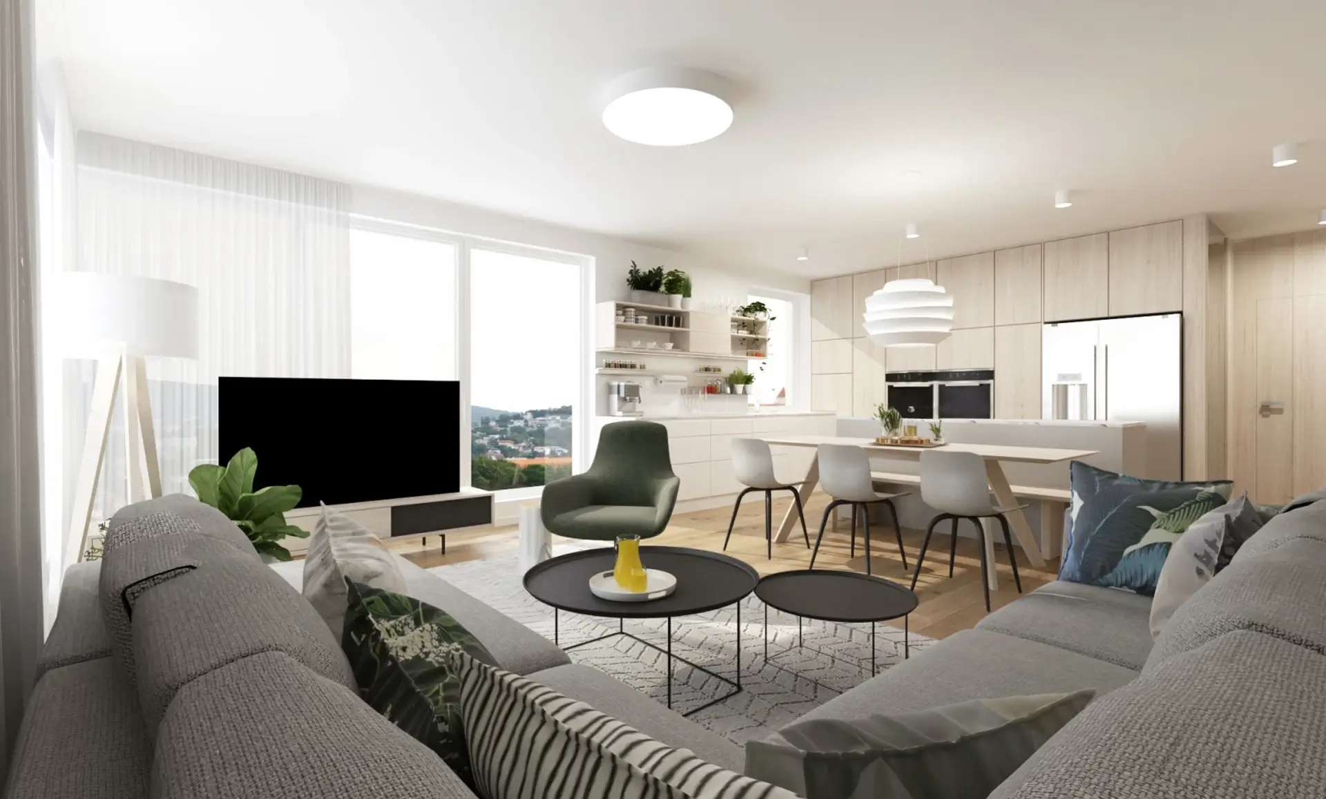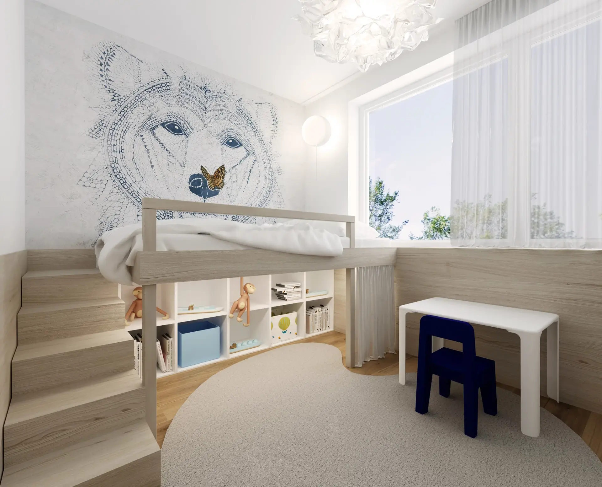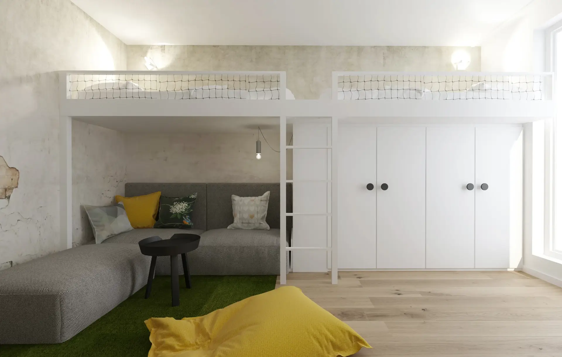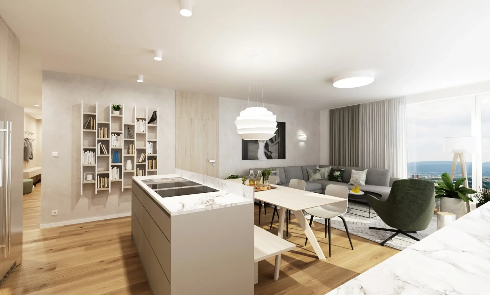 Srdcom bytu je plynulé prepojenie dennej zóny s rozľahlou terasou, ktorá slúži ako plnohodnotná súčasť bytu. Aby sme využili jej potenciál na maximum, navrhli sme tu súkromný wellness kútik so saunou a vonkajšou sprchou – ideálne miesto na regeneráciu s výhľadom na nočné mesto. Zvyšnú časť terasy tvorí oddychová zóna s množstvom zelene a pohodlným sedením, ktoré poskytuje dostatok súkromia pre nerušený relax alebo večerné posedenia s priateľmi. Časť je zastrešená pergolou, kde sme umiestnili exteriérovú kuchyňu a ukončená je miestom na cvičenie jógy pri východe slnka.Výsledkom je bývanie, ktoré spája mestskú dynamiku s maximálnym komfortom a pocitom slobody.