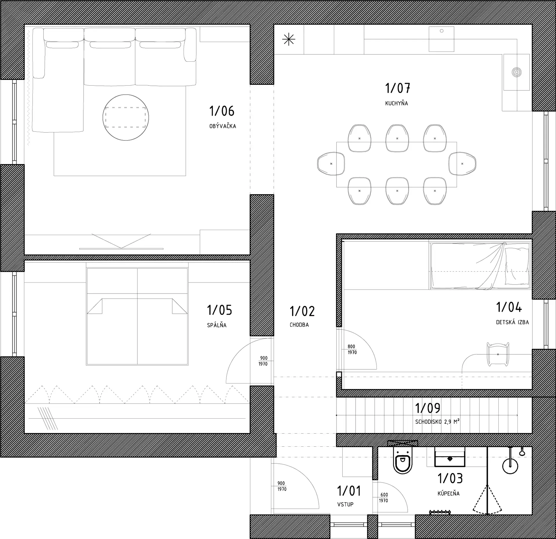 V malej predsieni sme využili vzniknutý roh a umiestnili doňho otvorený šatník. Spolu s dverami do kúpeľne tvoria jeden celok.