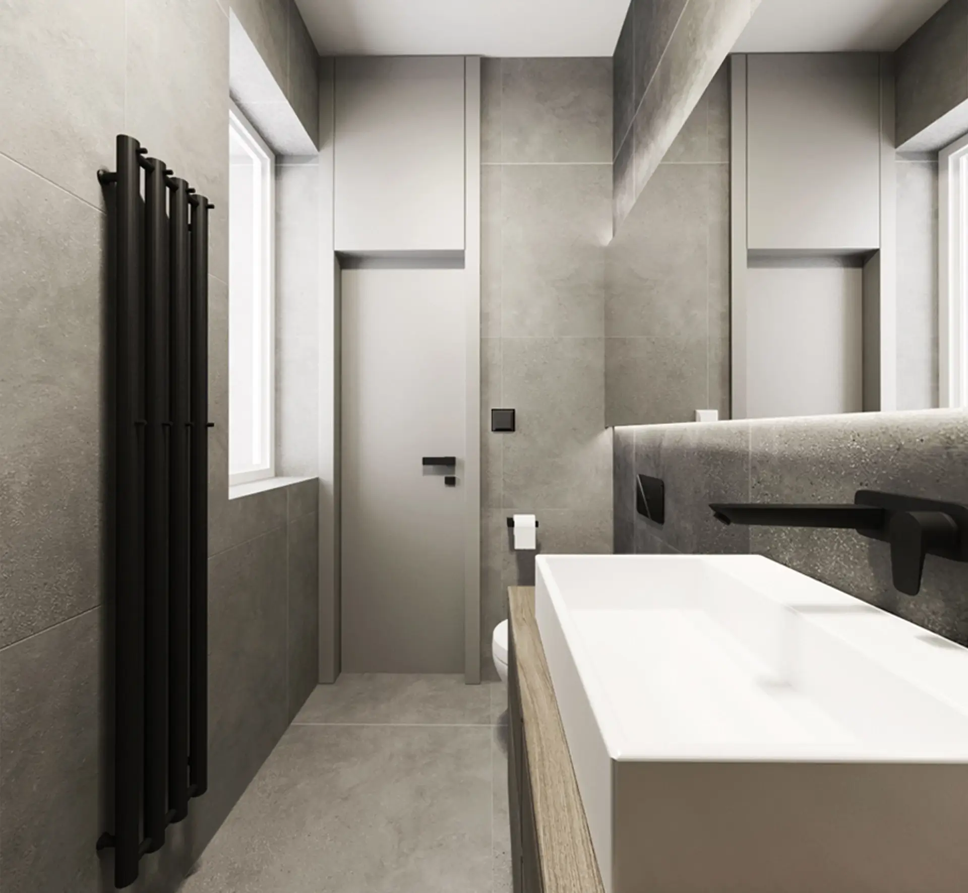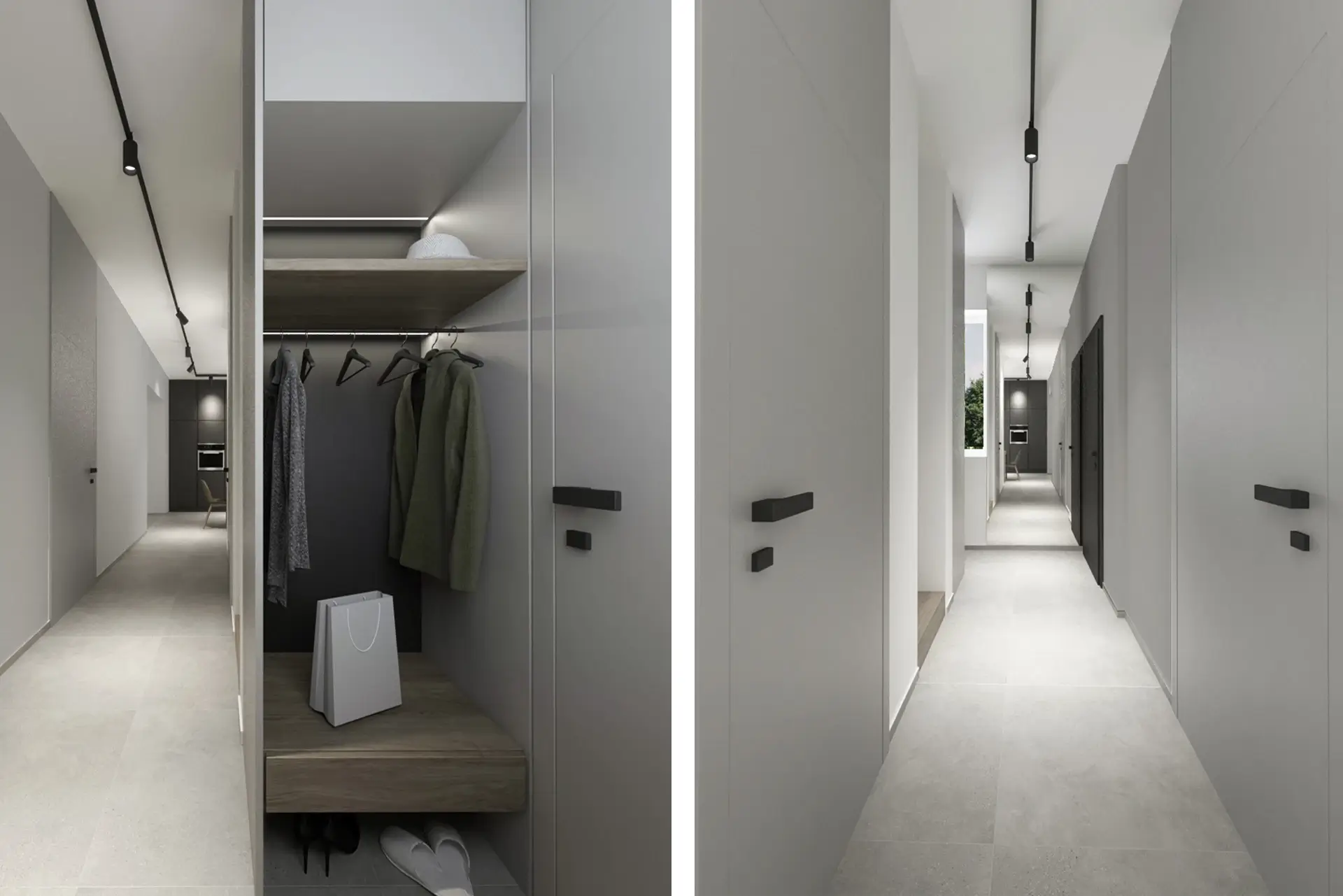 Monochromatický interiér v odtieňoch od bielej, šedej až po čiernu je doplnený moreným sivým dubom. Takto zjednotený interiér pôsobí čisto a minimalisticky, necháva vyniknúť štruktúry a jednotlivé objekty.