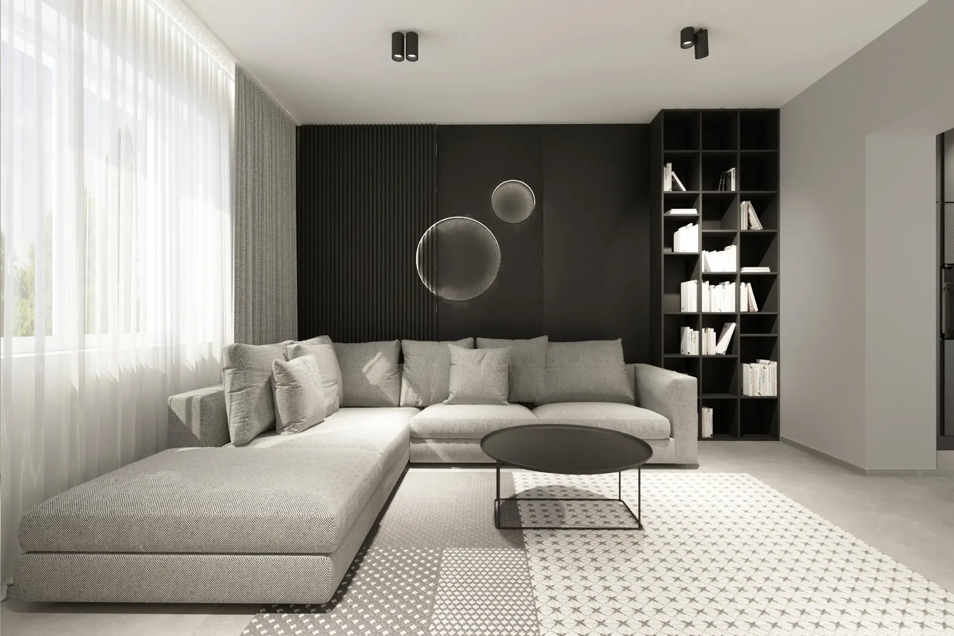 Obývačková stena spolu s kuchyňou tvorí jeden celok a je najtmavšou časťou interiéru. Za sedačkou sú umiestnené obkladové panely s lamelami, ukončuje ich knižnica až po strop. Pred panely sme zavesili okrúhle svietidlá ktoré tvarovo korešpondujú so stolíkom a dotvárajú atmosféru. Sedačka vo svetlej látke vynikne na tmavom pozadí.