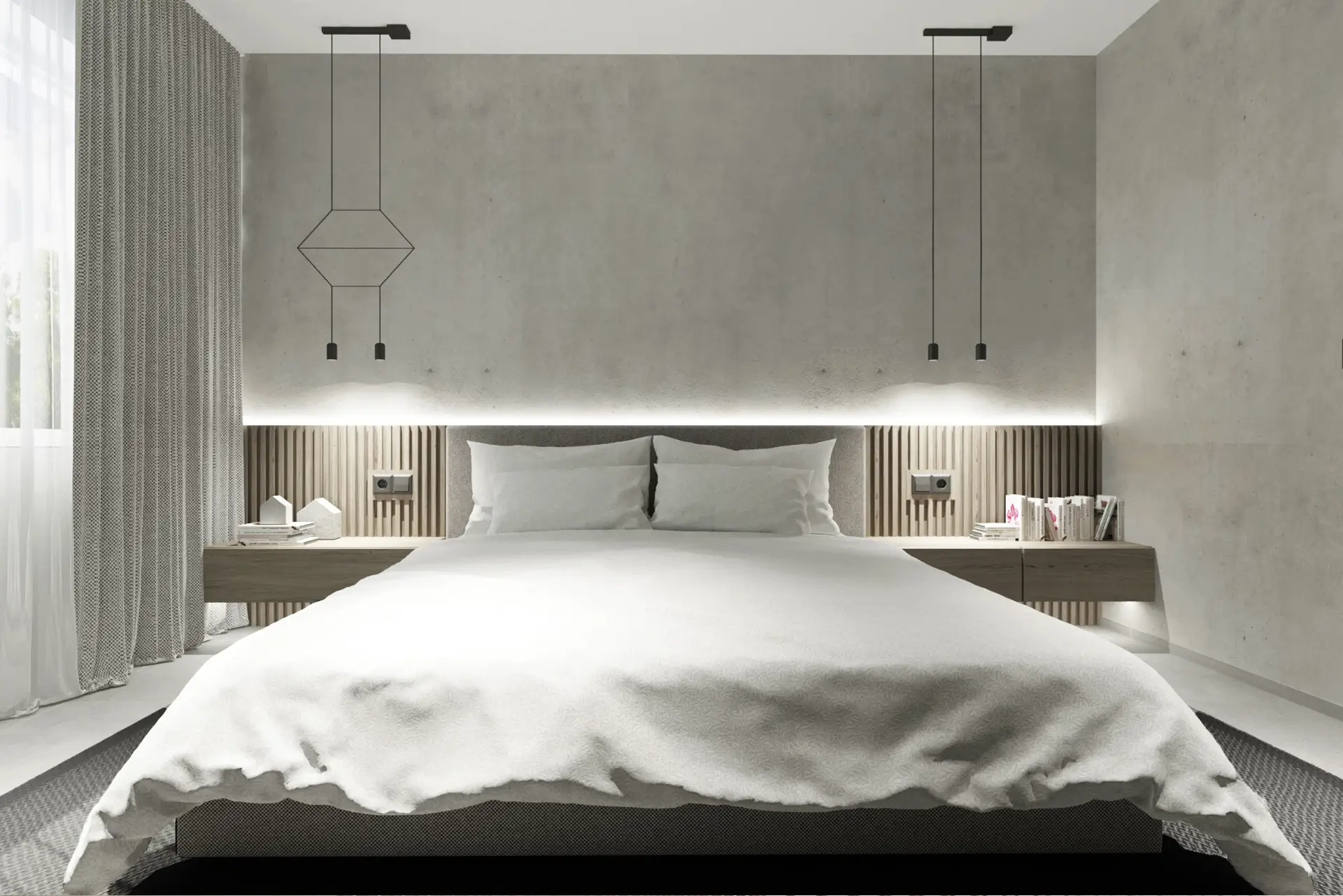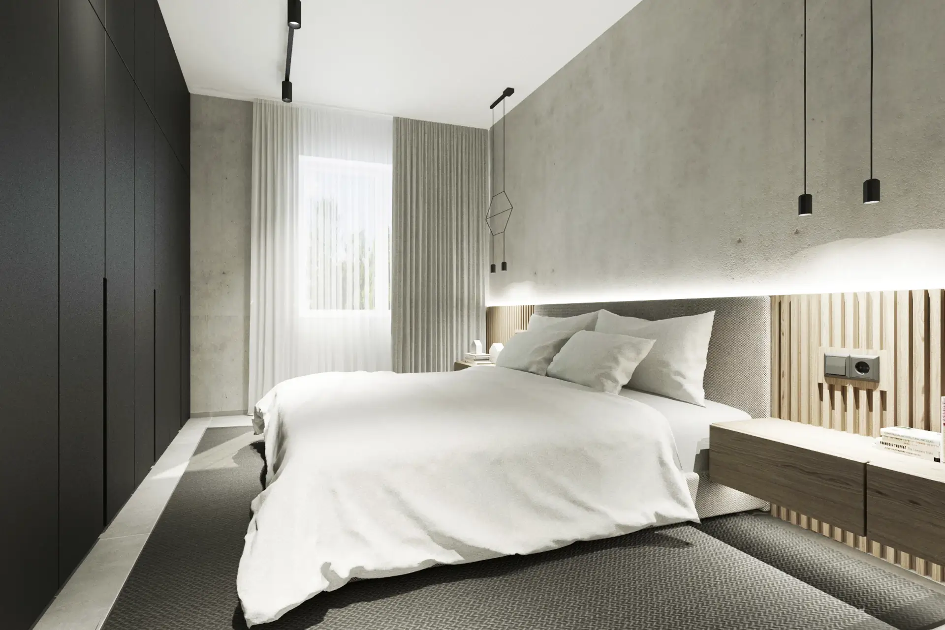 Interiér spálne s čiernym šatníkom je doplnený pohľadovým betónom na stenách. V záhlaví čalúnenej látkovej postele je nízky lamelový obklad so závesnými nočnými stolíkmi v sivom dube. Priestor sme osvetlili graficky zaujímavými závesnými svietidlami od firmy Vibia.