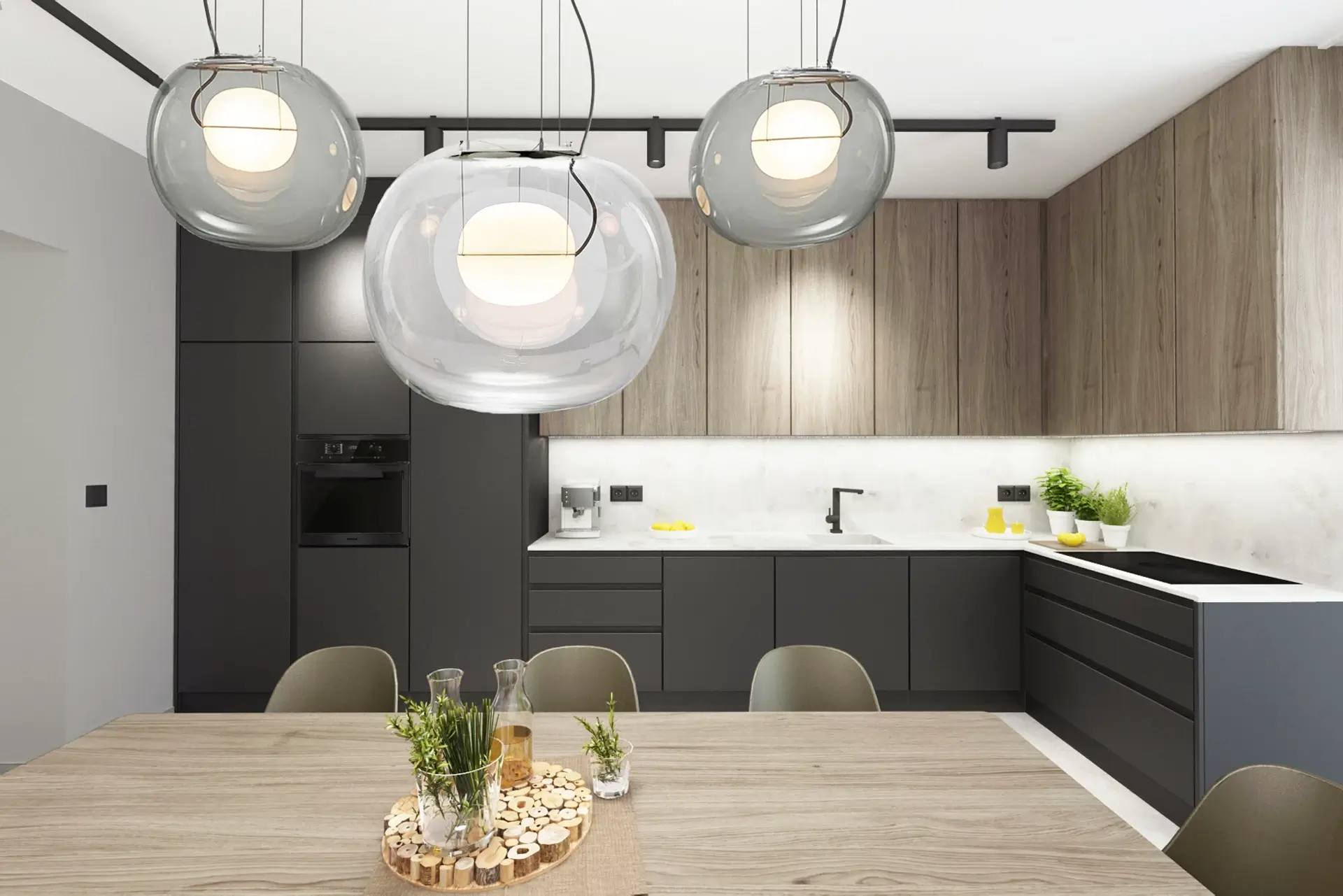 Kuchynská linka je kombináciou čiernej farby a sivého dubu na závesných skrinkách. Na pracovnú dosku a zástenu sme zvolili umelý kameň Technistone v prevedení Ambiente Light, kde sa strieda svetlá a tmavšia šedá štruktúra a prepája opticky oba materiály.