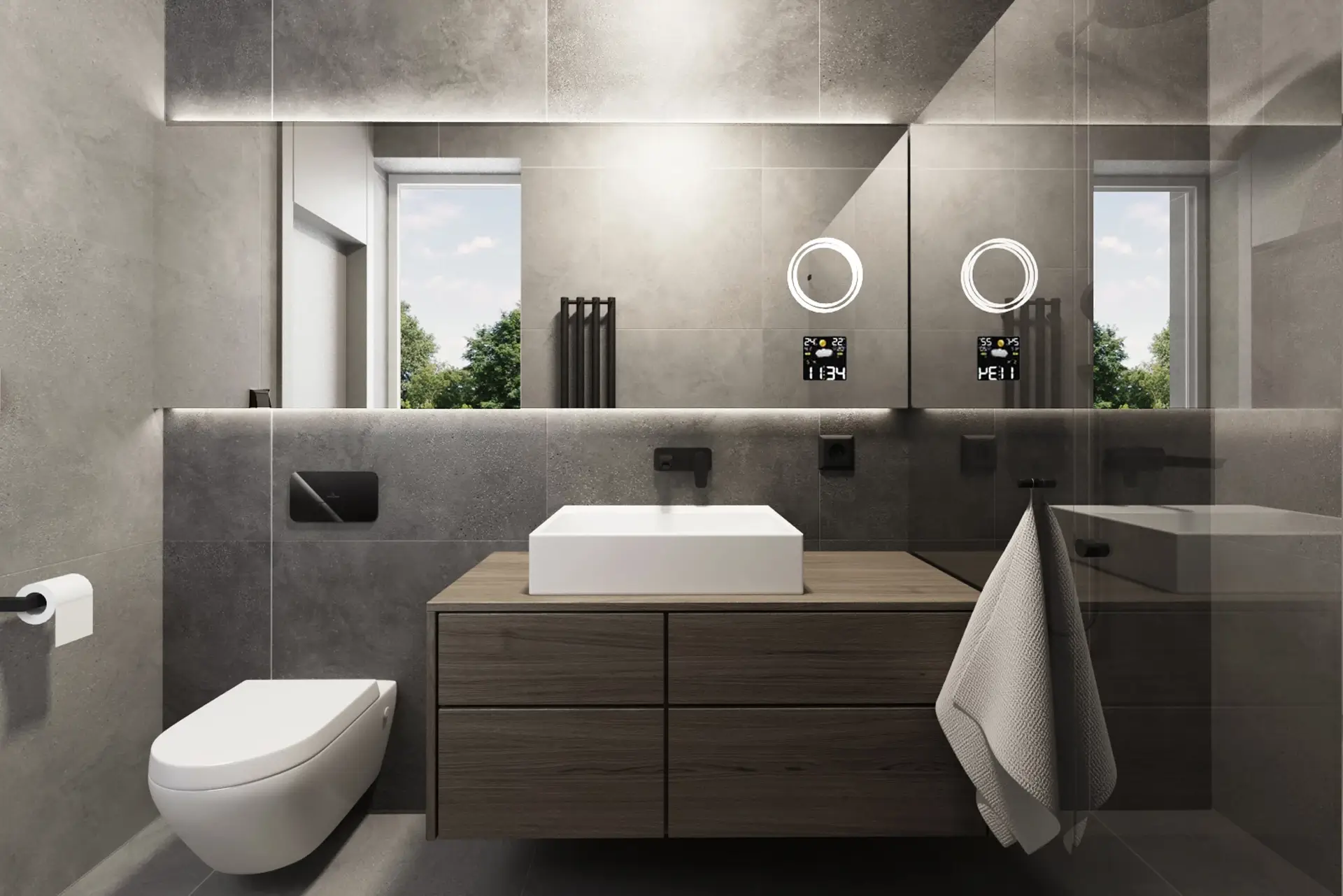 Ani v kúpeľni nechýba tmavý obklad a čierne doplnky. Použili sme veľké podsvietené zrkadlo na optické zväčšenie priestoru a do zadnej časti kúpeľne umiestnili sprchový kút.
