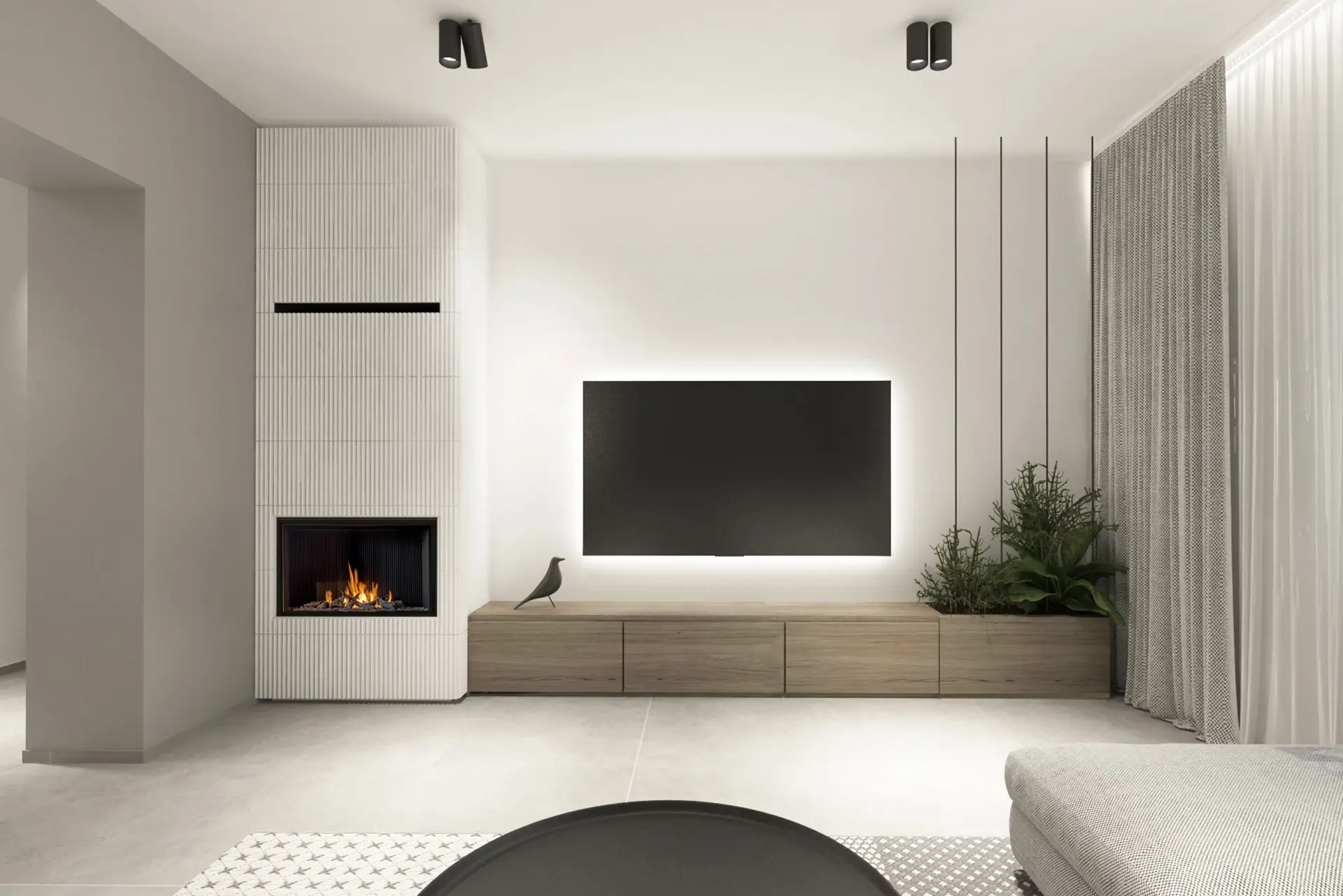 Súčasťou steny s tv je krb, na ktorý sme použili biely reliéfny obklad. Do skrinky pod televízorom sme integrovali kvetináč. Hmotu obstavby krbu tak časom vyvážia rastúce rastliny.